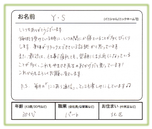 また、最近は、仕事で疲れても、翌朝には元気になっていることが多く、これもやまさき先生のおかげだと思います!