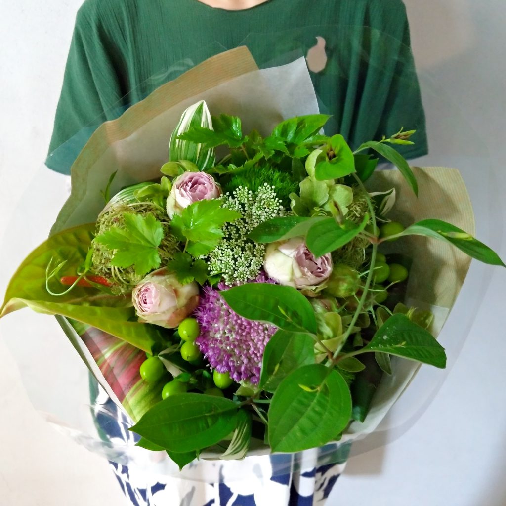 主人と一緒に買いに行き、「グリーンをベースに、ちょっと変わった感じで…」と要望を伝えたところ、こんなにも素敵な花束が完成。