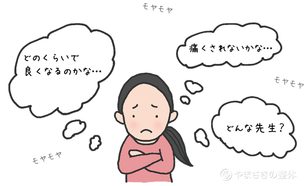 「痛くされないかな」「どんな先生だろう?」「どのくらいで良くなるのかな」「高額な商品やサプリメントなどを買わされないかな・・・」などなど、不安を数え上げればキリがありません。