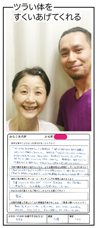 「つらいところを治してもらおう」という気持ちが「自分で出来る所は自分で調整してみよう」という気持ちになりました。施術後「こんな風にやってみるといいですよ」と教えて下さったことを試してみたり、立ち読みで仕入れたストレッチとか自分なりに体を動かしてみるクセがつきました。施術後の体がシャン!!とした気持ちよさうを体感すると不調になってくる前後に気づくようになるんですねぇ~。