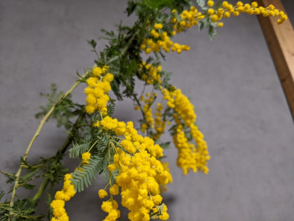 昨年に比べると今回のミモザは花の部分が少なかったので、二人で(友之さんもミモザ好き)やや残念がっていたのですが、ちょうどその日の私のお花のお稽古がミモザを使った投げ入れ。